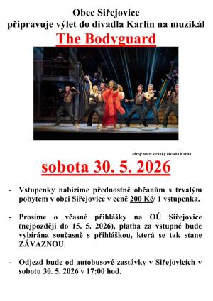 Obec Siřejovice připravuje výlet do divadla Karlín na muzikál. Vstupenky budou nabídnuty přednostně občanům s trvalým pobytem v obci za cenu 200 Kč za jednu vstupenku.