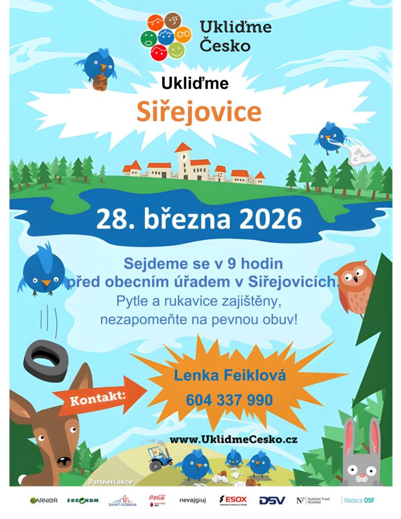 Nastal čas vzít rukavice, pytle a dobrou náladu a společně vyrazit do akce! Čeká nás hlavní úklidová událost roku v Siřejovicích, která je součástí velké celorepublikové výzvy Ukliďme Česko