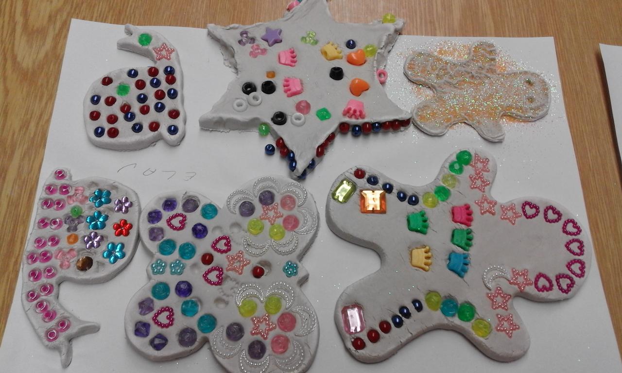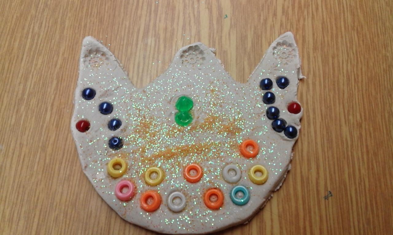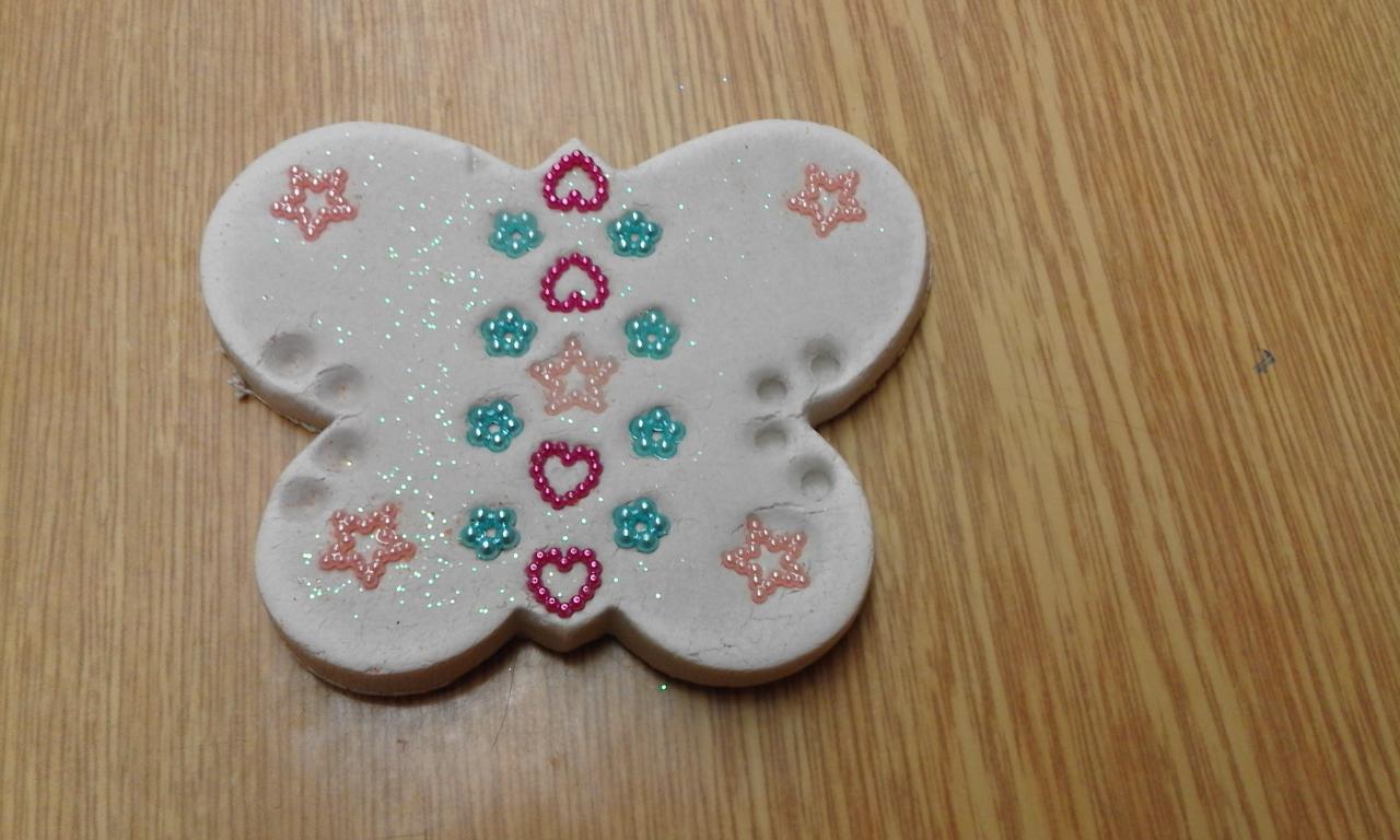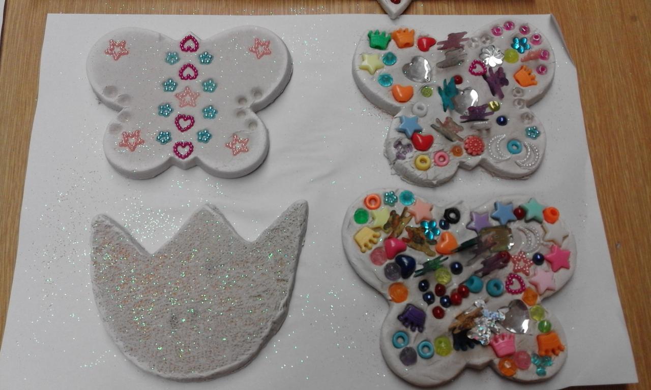 V březnu jsme se opět vrátili k našemu nejoblíbenějšímu materiálu, kterým je samotvrdnoucí modelovací hmota. Hmotu jsme si nejprve vyváleli, pomocí vykrajovátek jsme si vytvořili potřebné tvary a ty jsme pak postupně zdobili pomocí různých kamínků, korálků a mušliček. Poté bylo nutné nechat hmotu pořádně usušit.