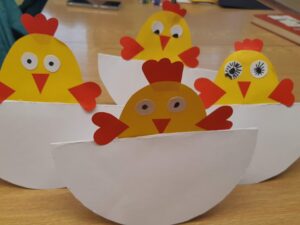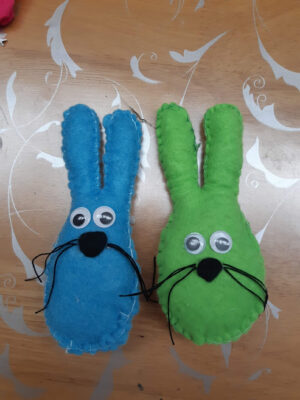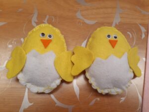 V březnu jsme si opět vyzkoušeli práci s tolik oblíbeným filcem. Sice někteří z nás maličko pozapomněli jak se používá jehlička, ale stačilo pár stehů a šití nám šlo pěkně od ruky. Ušili jsme si nádherná kuřátka líhnoucí se z vajíček a zajíčky.